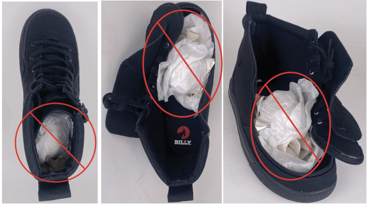 We require proper, supportive stuffing inside all our footwear products – from samples all the way to production. It is critical for the integrity of the shape and final appearance of the shoe. It is especially important that our stuffing requirements are followed because our designs are more at risk of deformation due to the specialized zipper construction.