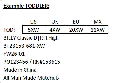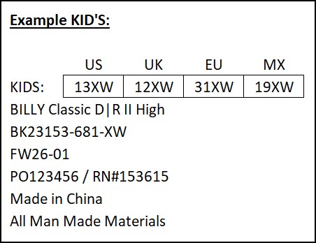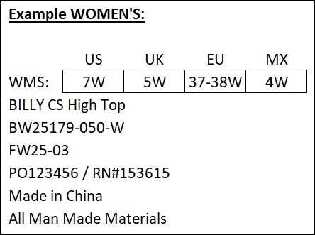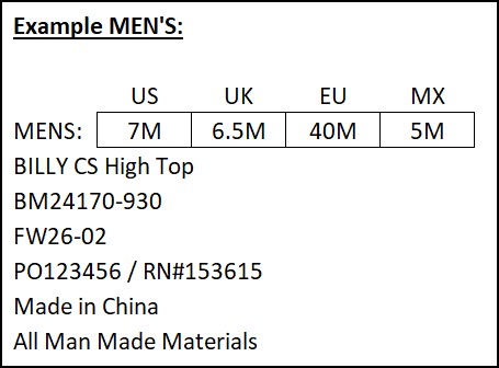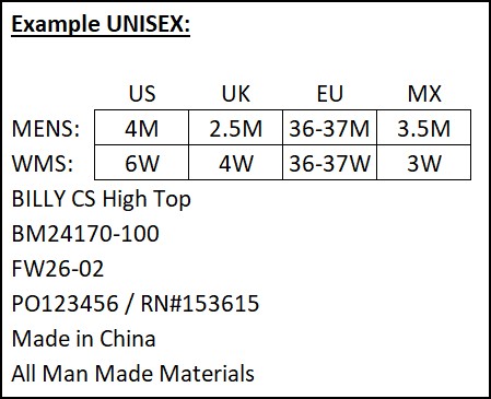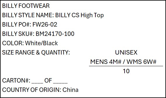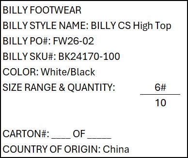 Starting with FW26 production, we have added new requirements for the carton markings of UNISEX styles. BILLY Footwear team will provide the factory with a list of the unisex styles at the beginning of each season.
